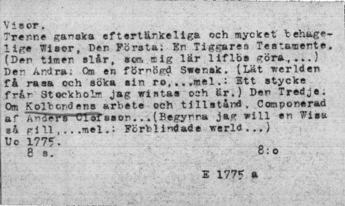//// Visor. //// Trenne ganska eftertärkeliga och mycket tehage-1 i ge 'Wisor, Den Första; Kn Tiggares Testamente. (Den timen slår, scg. mig lar liflos göra,,...} Den Andra; Om en förnöjd Svensk. (Lat verlden få rasa och söka sin ro,. ..mel.: Ett stycke frår Stockholm jag wistas och är.) Den Tredje; Om Koleendens arbete och tillstånd, Componerad af Iv^elPir^öTS^eson... (Begynna jag will en Wisa så ri 11.mel.; Förblindade werld ...) //// Uc 1775• //// .8 s. ' 8: o //// E 1775 a ////