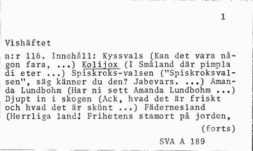 //// 1 //// Vishäftet //// n:r 116. Innehåll: Kyssvals (Kan det vara någon fara, ...) Kol ijox (I Småland där pimpla di eter ...) Spiskroks-valsen ("Spiskroksval-sen", säg känner du den? Jabevars. ...) Amanda Lundbohm (Har ni sett Amanda Lundbohm ...) Djupt in i skogen (Ack, hvad det är friskt och hvad det är skönt ...) Fädernesland (Herrliga land! Frihetens stamort på jorden, //// (forts) //// SVA A 189 ////