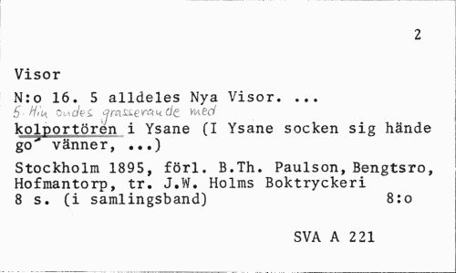 //// 2 //// Visor //// N:o 16. 5 alldeles Nya Visor. ... //// 5 HiiA ouo/ei vwecV //// kolportörén i Ysane (I Ysane socken sig hände go" vänner, ...) //// Stockholm 1895, förl. B.Th. Paulson, Bengtsro, Hofmantorp, tr. J.W. Holms Boktryckeri 8 s. (i samlingsband) 8:o //// SVA A 2 21 ////