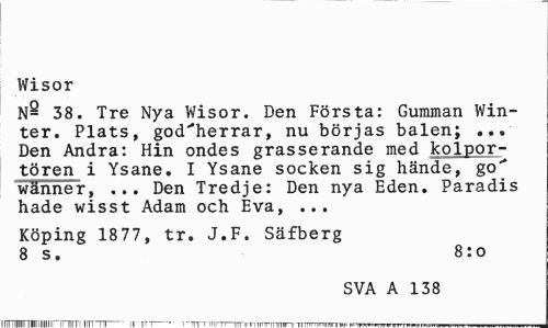 //// Wisor //// N- 38. Tre Nya Wisor. Den Första: Gumman Win-ter. Plats, godsherrar, nu börjas balen; ... Den Andra: Hin ondes grasserande med kolportören i Ysane. I Ysane socken sig hände, go' wänner, ... Den Tredje: Den nya Eden. Paradis hade wisst Adam och Eva, ... //// Köping 1877, tr. J.F. Säfberg 8 s. 8:o //// SVA A 138 ////