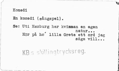 //// r- 1 //// Komedi //// i ¦ //// En komedi (sångspel). //// Se: Uti Hamburg har kvinnan en egen //// natur... //// Hör på ho' lilla Greta ett ord jag //// säga vill... //// j KB s sWAmqtrycksreg. ////