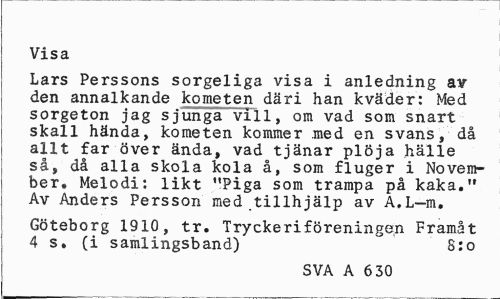 //// Visa //// Lars Perssons sorgeliga visa i anledning av den annalkande kometen däri han kväder: Med sorgeton jag sjunga vill, om vad som snart skall hända, kometen kommer med en svans, då allt far över ända, vad tjänar plöja hälle så, då alla skola kola å, som fluger i November, Melodi: likt "Piga som trampa på kaka." Av Anders Persson med tillhjälp av A.L-m, //// Göteborg 1910, tr. Tryckeriföreningen Framåt 4 s. (i samlingsband) 8:0 //// SVA A 6 30 ////