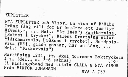 //// KUPLETTER //// NYA KUPLETTER och Visor. En visa af Bjälbo Dräng (Jag vill för Er berätta ett lustigt äfventyr, ... Mel.: "Är 1840") Komikervisa. tSaknas i trycket!. Balens Drottning eller Midsommarvals. [Saknas i trycket]. Nordpolsvisa (Häj, glada gossar, här en sång, ... Mel.: "Fiskarvals") //// Norrköping 1911, tr. Axel Norrmans Boktryckeri 4 s. (def.; s. 3-6 saknas) 8:o //// (i samlingsband med titeln GLADA & NYA VISOR Från VIKTOR JOHANSON SVA A 73? ////