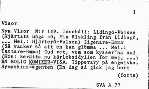 //// 1 //// Visor //// Nya Visor N:r 149. Innehåll: Lidingö-Valsen (Hjärtats unga mö, Min älskling från Lidingö, ••• Mel.: Hjärterö-Valsen) Zigenare-Emma^ (Så vacker så att en kan glömma ... Mel,: Tattare-Emma) Gud vet, vem som kysser"*na nul (Hon: Berätta nu kärleksidyllen för mej, .?.) EN ROLIG KOMIKER-VISA. Tipperary på engelska. Symaskins-agenten (En dag så gick jag bort //// (forts) SVA A 77 ////