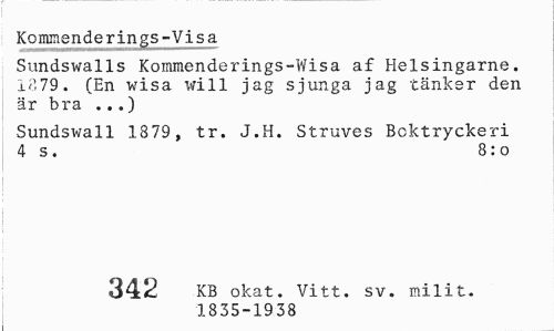 //// Kommenderings-Visa //// Sundswalls Kommenderings-Wisa af Helsingarne. 1879. (En wisa will jag sjunga jag tänker den är bra ...) //// Sundswall 1879, tr. J.H. Struves Boktryckeri 4 s. 8:o //// 342 KB okat. Vitt. sv. milit. //// 1835-1938 ////