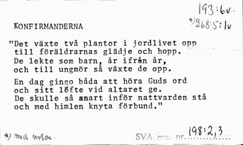 //// konfirmanderna //// i v //// "Det växte två plantor i jordlivet opp till föräldrarnas glädje och hopp. De lekte som barn, år ifrån år, och till ungmor så växte de opp. //// En dag gingo båda att höra Guds ord och sitt löfte vid altaret ge. De skulle så snart inför nattvarden stå och med himlen knyta förbund." //// V *iul Wt<H SVA —. nr. j.?.? ////