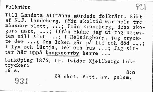 //// Folkrätt föl //// Till Landets allmänna mördade folkrätt. Bikt af N.J» Landeberg. (Min skoltid v^ar hela tre månader blott, Från Kronoberg, dess sko- //// gars natt, Ifrån Skåne jag ut tog attes- //// ten till slut I Helsingborg, jag tryck- //// te der Den leken går på lif och död //// I lyx och lättja, lek och rus Jag sit- //// ter här uppå kongsnorrby herre ... //// Linköping 1876, tr. Isidor Kjellbergs boktryckeri //// 16 s. 8:0 //// KB okat. Vitt. sv. polem. //// 931 ////