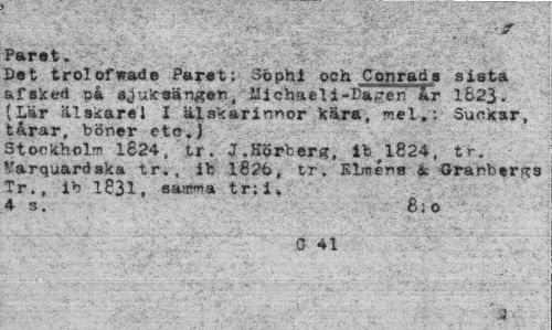 //// Paret. //// Det trolofwade Paret: Sophi och Conrad» sista af sked på, sjukeängen, Uichaeli-Dagen lr 1623. (Lär älskarel I älskarinnor kära, weU: Suckar, tårar, böner etc.) //// Storkholm 1824, tr. J.rörberg, ib>l824, tr. Varquardska tr., ib 1826, tr. Klméns $ Granbergs Tr., ib 1831, samma tr;i. 4 s. 8:o //// • G 41 ////
