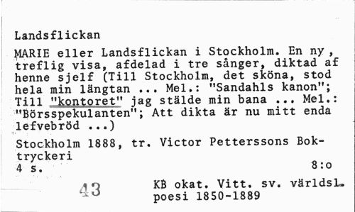 //// Landsflickan //// MARIE eller Landsflickan i Stockholm. En ny , treflig visa, afdelad i tre sånger, diktad af henne sjelf (Till Stockholm, det sköna, stod hela min längtan ... Mel.: "Sandahls kanon"; Till "kontoret" jag stälde min bana ... Mel.: "Börsspekulanten"; Att dikta är nu mitt enda lefvebröd ...) //// Stockholm 1888, tr. Victor Petterssons Boktryckeri //// 4 s. 8:0 //// 10 KB okat. Vitt. sv. världsL. //// 0 poesi 1850-1889 ////