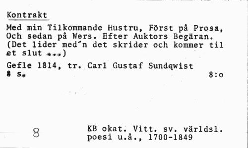 //// Kontrakt //// Med min Tilkommande Hustru, Först på Prosa, Och sedan på Wers. Efter Auktors Begäran. (Det lider med^n det skrider och kommer til et slut *..) //// Gefle 1814, tr. Carl Gustaf Sundqwist 8 s* 8:0 //// o KB okat. Vitt. sv. världsl. //// poesi u.å., 1700-1849 ////