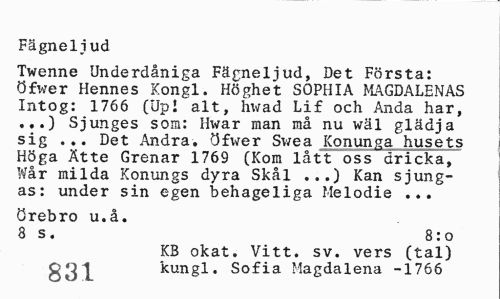 //// Fägneliud //// Twenne Underdåniga Fägneljud, Det Första: Öfwer Hennes Kongl. Höghet SOPHIA MAGDALENAS Intog: 1766 (Upl alt, hvad Lif och Anda har, .,.) Sjunges som: Hwar man må nu wäl glädja sig ... Det Andra, öfver Svea Konunga husets Höga Ätte Grenar 1769 (Kora lått oss dricka, Wår milda Konungs dyra Skål ...) Kan sjungas: under sin egen behageliga Melodie ... //// Örebro u.å. //// 3 s. 8:o //// KB okat. Vitt. sv. vers (tal) kungl. Sofia Magdalena -1766 ////