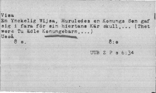 //// Visa | //// En Ynckelig Wijsa, Huruledes en Konungs Son gaf sig i fara för sin hiertans Kär skull,... (Thet vore Tu ädle Konungebarn,.,.) //// 8 s. 8; o //// UUB Z ? 3 6:34 ////