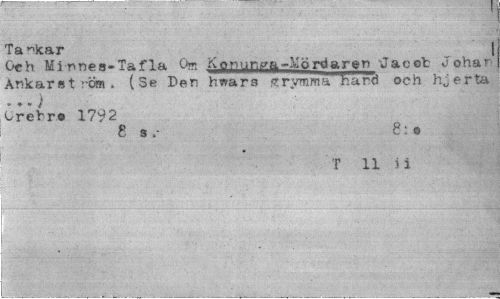 //// Tackar I //// Och Mi-nnea-Tafla Om Konnr.tm-Mördaren -Janot Johar Ankarström. (3e Den hwara srymma hand och hjerta //// Örebro 17^2 //// 8 s. 8:o //// T 11 ii ////