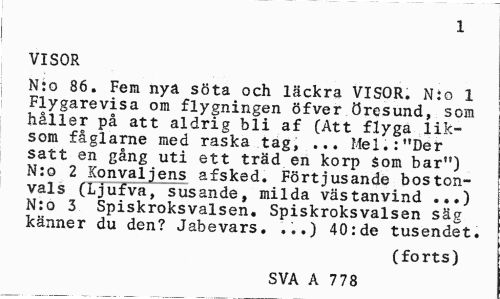 //// 1 //// VISOR //// N:o 86. Fem nya söta och läckra VISOR. Nio 1 Flygarevisa om flygningen öfver Öresund, som håller på att aldrig bli af (Att flyga liksom fåglarne med raska tag, ... Mel.:"Der satt en gång uti ett träd en korp Som bar") N:o 2 Konvaljens afsked. Förtjusande bostonvals (Ljufva, susande, milda västanvind ...) N:o 3 Spiskroksvalsen. Spiskroksvalsen säg känner du den? Jabevars. ...) 40:de tusendet. //// (forts) //// SVA A 778 ////