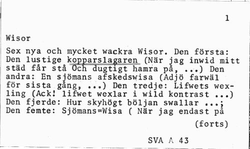 //// 2 //// Wisor //// Sex nya och mycket wackra Wisor. Den första: Den lustige kopparslagaren (När jag inwid mitt städ får stå Och dugtigt hamra på, ...) Den andra: En sjömans afskedswisa (Adjö farwäl för sista gang, ...) Den tredje: Lifwets wex-ling (Ack! lifwet wexlar i wild kontrast ...) Den fjerde: Hur skyhögt böljan swallar . Den femte: Sjömans=Wisa ( När jag endast på //// (forts) //// SVA A 920 ////