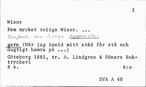 //// 2 //// Wisor //// Fem mycket roliga Wisor. ... //// be» (fen-te . AxA^e - //// åarn (När jag inwid mitt städ får stå och ugtigt hamra på ...) //// Göteborg 1885, tr. A. Lindgren & Söners Boktryckeri //// 8 s. 8: o //// SVA A 40 ////