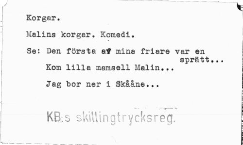 //// 1 //// Korgar. //// Malins korgar. Komedi. //// Se: Den första a-f mine friare var en //// sprätt... //// Kom lilla mamsell Malin... Jag bor ner i Skååne... //// KB;s skillingt rycks reg. ////