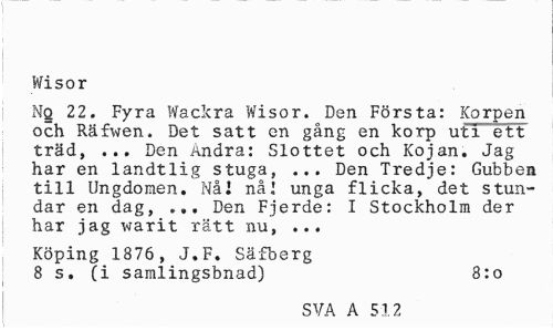 //// Wisor //// Nq 22. Fyra Wackra Wisor. Den Första: Korpen och Räfwen. Det satt en gång en korp utT ett träd, ... Den Ändra: Slottet och Kojan. Jag har en landtlig stuga, ... Den Tredje: Gubben till Ungdomen. Nål nål unga flicka, det stundar en dag, ... Den Fjerde: I Stockholm der har jag warit rätt nu, ... //// Köping 1876 , J.F. Säfberg //// 8 s. (i samlingsbnad) 8:o //// SVA A 512 ////