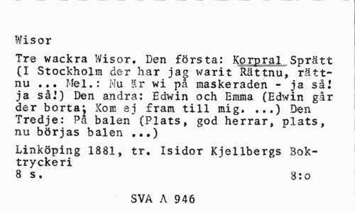 //// Wisor //// Tre wackra Wisor. Den första: Korpral Sprätt (I Stockholm der har jag warit Rättnu, rätt-nu ... Mel.: Nu är wi på maskeraden - ja sål ja så.1) Den andra: Edwin och Emma (Edwin går der borta; Kom ej fram till mig. ...) Den Tredje: På balen (Plats, god herrar, plats, nu börjas balen ...) //// Linköping 1881, tr. Isidor Kjellbergs Boktryckeri //// 8 s. 8:0 //// SVA A 946 ////