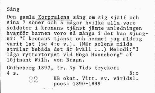 //// Sång //// Den gamla Korpralens sång om sig själf och sina 7 söner och 5 mågar hvilka alla voro soldater i kronans tjänst jämte anledningen hvarför barnen voro så många i det han sjunger: "I kronans tjänst o'"h hemmet jag aldrig varit lat (se 4:e v.)' (När solens milda strålar bebåda det är kväll ...) Melodi:"I låga ryttartorpet vid Höga Hunneberg" af löjtnant Wilh. von Bra^n. //// Götheborg 189 7, tr. Ny Tids tryckeri 4 s. 8: o //// oo KB okat. Vitt. sv. världsl. poesi 1890-1899 ////