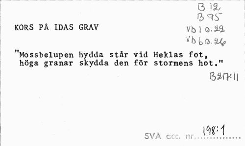 //// O IStr //// KORS PÄ IDAS GRAV //// "Mossbelupen hydda står vid Heklas fot, höga granar skydda den för stormens hot." //// il //// SVA er:. nr.J^i.1... ////