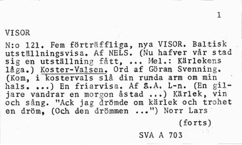 //// 1 //// VISOR //// N:o 121. Fem förträffliga, nya VISOR. Baltisk utställningsvisa. Af NELS. (Nu hafver vår stad sig en utställning fått, ... Mel.: Kärlekens låga.) Kos ter-Valsen. Ord af Göran Svenning. (Kom, i kostervals slå din runda arm om min hals. ...) En friarvisa. Af &.A, L-n. (En gil-jare vandrar en morgon åstad ...) Kärlek, vin och sång, "Ack jag drömde om kärlek och trohet en dröm, (Och den drömmen ...") Norr Lars //// (forts) //// SVA A 703 ////
