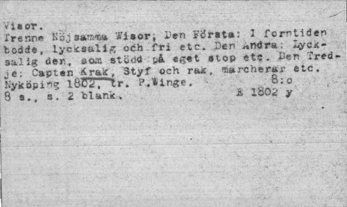 //// Vi »or. //// Irenne Söj strama Wi»ori Pen Första: 3 forntiden bodde, iycicsalig och fri etc. Den j*ndra: I^yc*-salig den., öoä stödd på. eget stop- etc. Den Tredje; Capten £raic, 3tyf och rak, marcherar etc, Nyköping 1802, "tr. P.Hinge. 8; o //// 8 s., s. 2 blank. i 1802 y ////