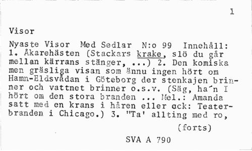 //// 1 //// Visor //// Nyaste Visor Med Sedlar N:o 99 Innehåll: 1. Åkarehästen (Stackars krake, slö du går mellan kärrans stänger, ...) 2. Den komiska men gräsliga visan som ännu ingen hört om Hamn-Eldsvadan i Göteborg der stenkajen brinner och vattnet brinner o.s.v. (Säg, ha'n I hört om den stora branden ... Mel.: Amanda satt med en krans i håren eller ack: Teaterbranden i Chicago.) 3. "Ta' allting med ro, //// (forts) //// SVA A 790 ////