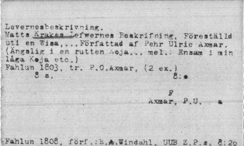 //// Le ve rnesbesk rivning. //// »/p + fw Kyav«.» Eeskrifning, Föreställd //// uti en Wisa,..,Författad af Pehr Ulric Axmar. '{Ängslig i en rutten mel.; Ensam i min //// låga Keja etc.) //// Fahlun I803, tr. P.O.åxaar, (2 ex.) //// S s, 8; e //// F //// rtsaar, P.U. a //// 1 VaVilnw 1 RrtP fnrf • "k Jfe HTTS 7. ? • ? ////