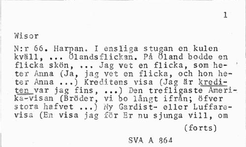 //// 1 //// Wisor //// N:r 66. Harpan, I ensliga stugan en kulen kväll, ... ölands flickan. På Öland bodde en flicka skön, ... Jag vet en flicka, som he- ' ter Anna (Ja, jag vet en flicka, och hon heter Anna ...) Kreditens visa (Jag är krediten var jag fins, ...) Den trefl igas te Amerika-visan (Bröder, vi bo långt ifrån; öfver stora hafvet ...) Ny Gardist- eller Luffarevisa (En visa jag för Er nu sjunga vill, om //// (forts) //// SVA A 864 ////