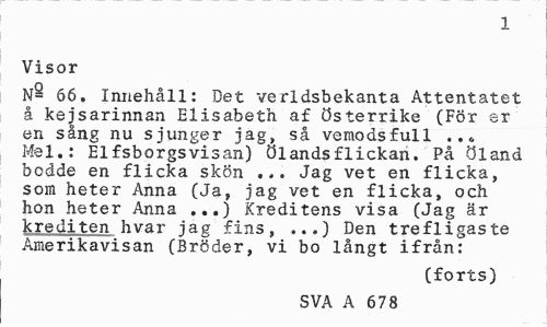 //// 678 //// Visor //// N- 66. Innehåll: Det verldsbekanta Attentatet å kejsarinnan Elisabeth af Österrike (För sr en sång nu sjunger jag, så vemoasfull ..* Mel.: Elfsborgsvisan) öl ands flickan. På Öland bodde en flicka skön ... Jag vet en flicka, som heter Anna (Ja, jag vet en flicka, och hon heter Anna ...) Kreditens visa (Jag är krediten hvar jag fins, ...) Den trefligaste Amerikavisan (Bröder, vi bo långt ifrån: //// (forts) //// SVA A 790 ////