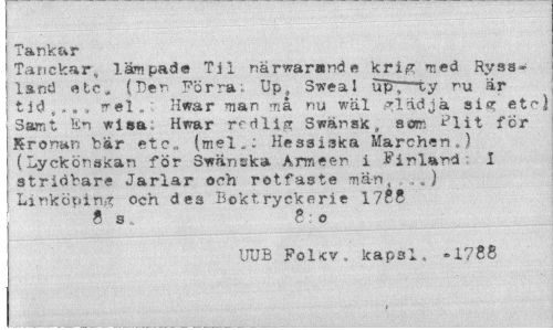 //// Tankar //// Tanckar, lämpade Ti i närwarande kri£ med Ryssland «tc„ (Der. Förra; L7p, Sweal up", "ty nu är tid,».» rr«l. Hwar man må nu wäl glädja si* etc) 3amt Kn wisa. Hwar rrdlist SwänsK, som i t for Kronan bär etc„ (mel.; Hessiska Marchen.) (Lyckönskan för Swänska Armeen i Finland: 1 stridbare Jarlar och rotfaste -nan, ,.) Linköping och des Bokt.ryckerie 1788 8 s 8:o //// UUB Fol<v. kapsl. »1788 i ////
