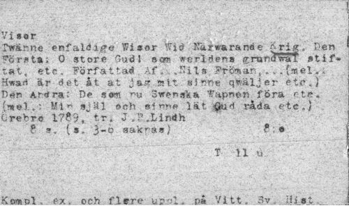 //// Visor • //// Tw&ane enfaldige Wisor Wid Karwa rande Krig'.' Den företa; O store Gud J s® we rid. ens ^mnowat stif* tat, etc. "Författad Af»..Sila Fröman, ... (mel -. Kwad är .det åt at jas mit sinne q säljer etc.) Den Anrfra." D<> som nu 3wenirka apnefi fora rtc. 'mel.-: Mi själ ©eh s inne lät $ud råda etc»/ brebre l?«9, ,tr. J.&.Lindh //// v (s. 3-0 saknas} « //// '-'v./'"' " . ' %f: t n u.. / ;/-'/• //// Komol. ex. och flere U2&1* pa Vitt. 3v„ Hist,___ ////