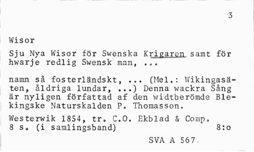 //// 3 //// Wisor //// Sju Nya Wisor för Swenska Krigaren samt för hwarje redlig Swensk man, //// namn så fosterländskt, ... (Mel.: Wikingasä-ten, åldriga lundar, ...) Denna wackra Sång är nyligen författad af den widtberömde Blekingske Naturskalden P. Thomasson. //// Westerwik 1854, tr» C.O. Ekblad & Comp» 8 s. (i samlingsband) 8:o //// SVA A 56 7. ////