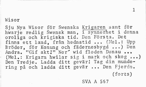 //// 1 //// Wisor //// Sju Nya Wisor för Sv/enska Krigaren samt för hwarje redlig Swensk man, i synnerhet i denna oroliga och krigiska tid» Ben Första. Det finns ett land, från hednatid ... (Mel.: Upp Bröder, för Konung och fädernesbygd .,.) Den Andra. "Gif akti" Ner" wid floden Donau ... (Mel.: Krigarn hwilar sig i mark och skog 0.,) Den Tredje. Ladda ditt gevärl Tag din mundering på och ladda ditt gevär ... Den Fjerde» //// (forts) //// SVA A 56 7 ////
