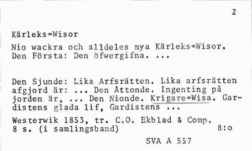 //// 2 //// Kärleks=Wisor //// Nio wackra och alldeles nya Kärleks=Wisor. Den Första: Den öfwergifna. ... //// Den Sjunde: Lika Arfsrätten. Lika arfsrätten afgjord är: ... Den Åttonde. Ingenting på jorden är, ... Den Nionde. Krigare=Wisa. Gar-distens glada lif, Gardistens ... //// Westerwik 1853, tr. C.O. Ekblad & Coinp, 8 s. (i samlingsband) 8:o //// SVA A 55 7 ////