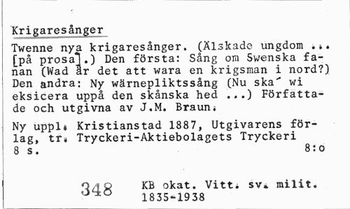 //// Twenne nya krigaresånger. (Älskade ungdom ,i. [på prosal.) Den första: Sång om Swenska fanan (Wad ar det att wara en krigsman i nord?) i Den andra: Ny wärnepliktssång (Nu ska" wi eksicera uppå den skånska hed ...) Författade och utgivna av J.M. Braun* //// Ny uppla Kristianstad 1887, Utgivarens förlag, tr« Tryckeri-Aktiebolagets Tryckeri 8 s. 8:0 //// O^Q KB okat. Vitt i sv* milit. 1835*1938 ////
