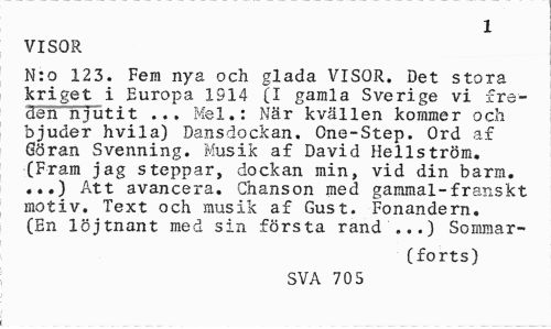 //// 1 //// VISOR //// N:o 123. Fem nya och glada VISOR. Det stora kriget i Europa 1914 (I gamla Sverige vi freden njutit ... Mel.: När kvällen kommer och bjuder hvila) Dansdockan. One-Step. Ord af Göran Svenning. Musik af David Hellström. (Fram jag steppar, dockan min, vid din barm. ...) Att avancera. Chanson med gammal-franskt motiv. Text och musik af Gust. Fonandern. (En löjtnant med sin första rand'...) Sommar- //// (forts) //// SVA 705 ////