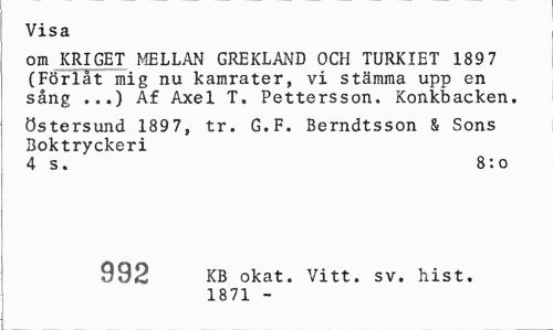//// Visa //// om KRIGET MELLAN GREKLAND OCH TURKIET 189 7 (FöTTat~mig nu kamrater, vi stämma upp en sång ...) Af Axel T, Pettersson. Konkbacken. //// Östersund 1897, tr. G.F. Berndtsson & Sons Boktryckeri //// 4 s. 8: o //// 992 KB okat. Vitt. sv, hist. //// 1871 - ////