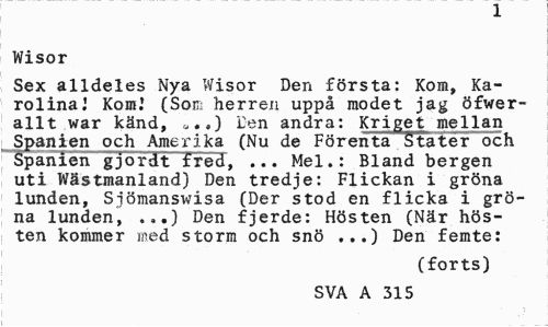 //// X //// Wisor //// Sex alldeles Nya Wisor Den första: Kom, Karolina! Kom! (Som herren uppå modet jag öfwer-allt war känd, «?.) Ten andra: Kriget^ mellan Spanien och Amerika (Nu de Förenta Stater och Spanien gjordt fred, ... Mel.: Bland bergen uti Wästmanland) Den tredje: Flickan i gröna lunden, Sjömanswisa (Der stod en flicka i gröna lunden, ...) Den fjerde: Hösten (När hösten kommer med storm och snö ...) Den femte: //// (forts) //// SVA A 315 ////