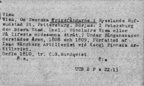 //// k -?.'Vv; ..t y. • .. . .. ... T •¦T. •.. ' . . -••- -.; .••• ' ' - . - . ••':.•• '¦ . V--".' .y. .. • • - //// Viou //// Wisa, Om Swenska J^^^i^^je ^ Hy8»lands Huf-wudstad St . PetterscurgBörjas; I Petersburg den Stora Stad. (mel,; Sinclairs Wisa eller På lifwéts mödosamma Stråt.) Under Fångenskapen derstädes åren, 1808 och 1809, Författad af Isac Wångberg Artillerist wid Kengl Finnska Artilleriet. //// "efle 1810, tr. C.0.Sundqwist //// 8 s. 8: • //// UTJB Z P s 22; 13 ////