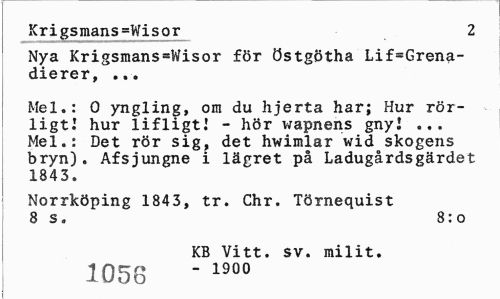 //// Krigsmans=Wisor 2 //// Nya Krigsmans=Wisor för östgötha Lif=Grena-dierer, ... //// Mel.: O yngling, om du hjerta har; Hur rörligt! hur lifligt.' - hör wapnens gny! ... Mel.: Det rör sig, det hwimlar wid skogens bryn). Afsjungne i lägret på Ladugårdsgärdet 1843. //// Norrköping 1843, tr. Chr. Törnequist 8 s. 8:o //// KB Vitt. sv. milit. //// 1058 " 1900 ////