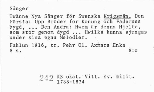 //// Sånger //// Twänne Nya Sånger för Swenska Krigsmän. Den Första: Upp Bröder för Konung och Fädernes bygd, ... Den Andra: Hwem är denna Hjelte, som stor genom dygd ... Hwilka kunna sjungas under sina egna Melodier. //// Fahlun 1816, tr. Pehr 01. Axmars £nka 8 s. 8:o //// 940 KB okat. Vitt. sv. milit. % 1788-1834 ////