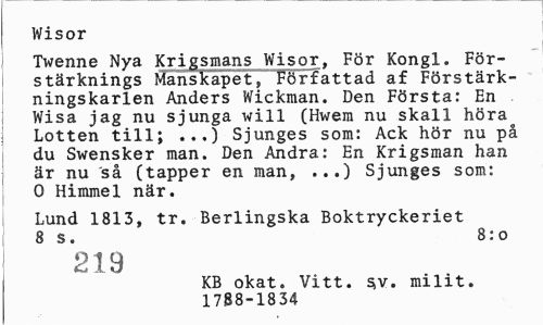 //// Wisor //// Twenne Nya Krigsmans Wisor, För Kongl. Förstärknings Manskapet, Författad af Förstärkningskarlen Anders Wickman. Den Första: En Wisa jag nu sjunga will (Hwem nu skall höra Lotten till; ...) Sjunges som: Ack hör nu på du Swensker man. Den Andra: En Krigsman han är nu så (tapper en man, ...) Sjunges som: 0 Himmel när. //// Lund 1813, tr. Berlingska Boktryckeriet 8 s. 8:o //// 219 //// KB okat. Vitt. sv. milit. 1788-1834 ////