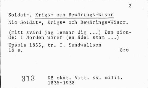 //// 2 //// Soldat=, Krigs= och Bewärings =Wisor Nio Soldat = , Krigs = och Bewär.ings=Wisor. //// (mitt svärd jag leirmar dig ...) Den nionde: I Norden wärer fen ädel stam ...) //// Upsala 1855, tr. I. Sundwallson //// 16 s. 8:o //// Q1 2 KB okat. Vitt. sv. milit. 1835-1938 ////