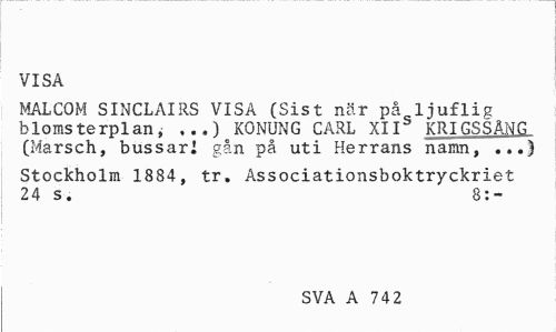//// VISA //// MALCOM SINCLAIRS VISA (Sist när på ljuflig blomsterplan, ...) KONUNG CARL XIIS KRIGSSÄNG (Marsch, bussar! gån på uti Herrans namn, ...} //// Stockholm 1884, tr, Associationsboktryckriet 24 s. 8:- //// SVA A 742 ////