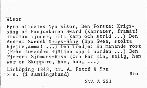 //// Wisor //// Fyra alldeles Nya Wisor, Den Första: Krigssång af Fanjunkaren Swärd (Kamrater, framåt! Trumman ljuder; Till kamp och strid ...) Den Andra: Swensk Krigs=Sång (Upp Swea, stolta hjelte ,amma.' Den Tredje: En manande röst //// (Från tusenåra fjällen upp i norden Den //// Fjerde: Sjömans=Wisa (Och Far min, salig, han war en Skeppare, han, han, ...) //// Linköping 1848, tr. A. Petré & Son 8 s. (i samlingsband) 8:0 //// SVA A 551 ////