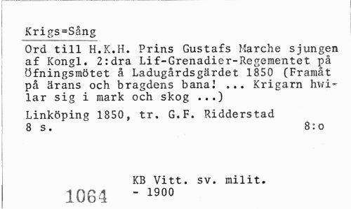 //// Krigs=Sång //// Ord till H.K.H. Prins Gustafs Marche sjungen af Kongl. 2:dra Lif-Grenadier-Regementet på Öfningsmötet å Ladugårdsgärdet 1850 (Framåt på ärans och bragdens banal ... Krigarn hwi-lar sig i mark och skog ...) //// Linköping 1850, tr» G.F. Ridderstad 8 s. 8: o //// KB Vitt. sv. milit. //// 1064 " 1900 ////
