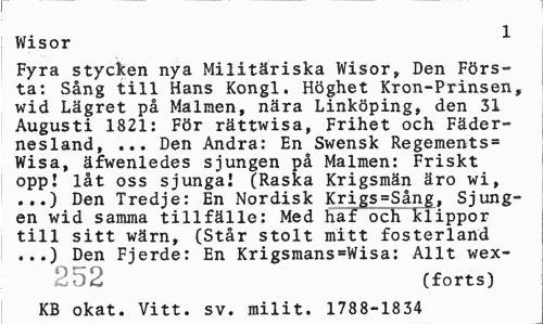 //// Wisor 1 //// Fyra stycken nya Militäriska Wisor, Den Första: Sång till Hans Kongl. Höghet Kron-Prinsen, wid Lägret på Malmen, nära Linköping, den 31 Augusti 1821: För rättwisa, Frihet och Fädernesland, ... Den Andra: En Swensk Regements= Wisa, äfwenledes sjungen på Malmen: Friskt opp! låt oss sjunga! (Raska Krigsmän äro wi, ...) Den Tredje: En Nordisk Krigs=Sång, Sjungen wid samma tillfälle: Med haf och klippor till sitt wärn, (Står stolt mitt fosterland ...) Den Fjerde: En KrigsmanssWisa: Allt wex- //// 252 (forts) //// KB okat. Vitt. sv. milit. 1788-1834 ////