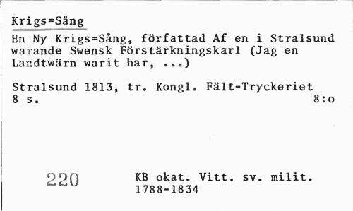 //// Krigs=Sång //// En Ny Krigs=Sång, författad Af en i Stralsund warande Swensk Förstärkningskarl (Jag en Landtwärn warit har, ..») //// Stralsund 1813, tr. Kongl. Fält-Tryckeriet 8 s. 8:0 //// 220 KB ekat» Vitt. sv. milit. //// 1788-1834 ////